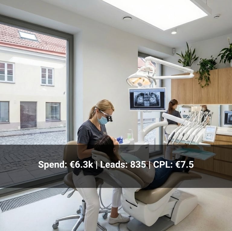 I built a high-performance lead gen engine for a dental clinic, achieving a consistent CPL of €7.5 for calls and form submissions. By implementing a custom server-side tracking environment, I bypassed ad-blockers and cookie restrictions to ensure >95% data accuracy. Despite strict Google healthcare policies, I successfully scaled the account to 835 lead conversions on a €6.3k spend by identifying high-converting niches and optimizing service pages.